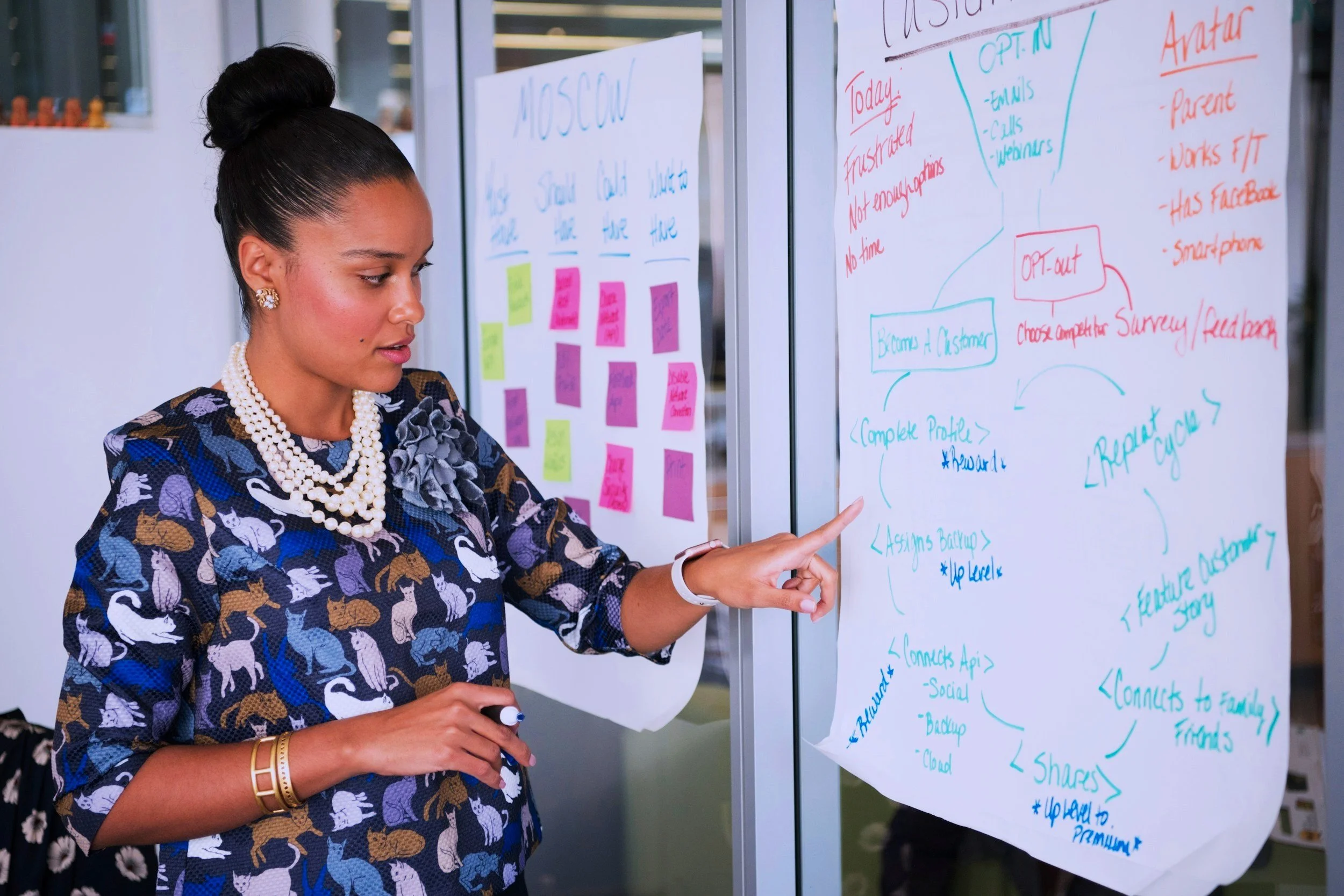 A woman is pointing at a whiteboard with notes and diagrams, wearing a patterned dress with swans, pearl necklace, and gold bracelets, in an office setting.