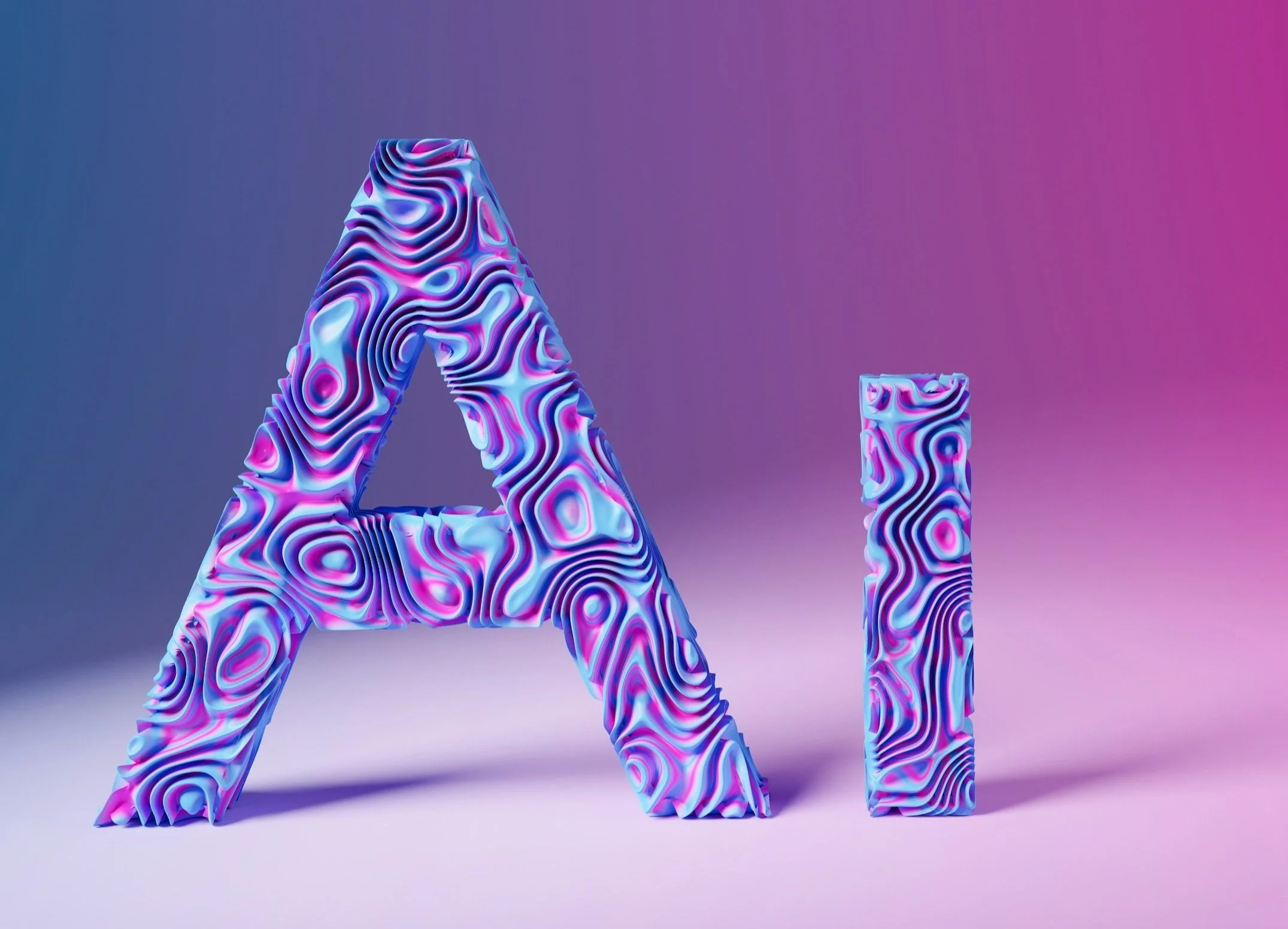 Colorful, abstract, 3D letters 'A' and 'I' with swirling, vibrant pattern against a gradient background.